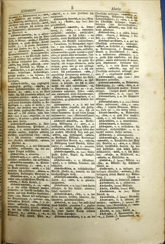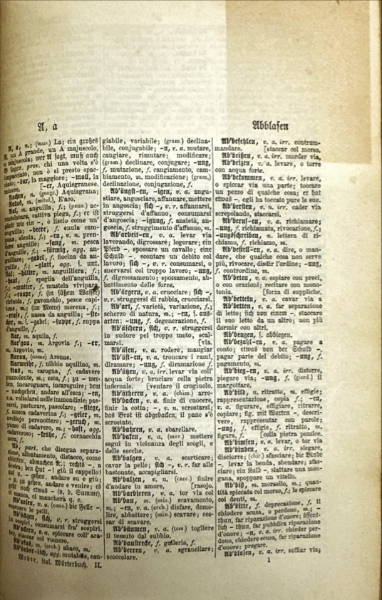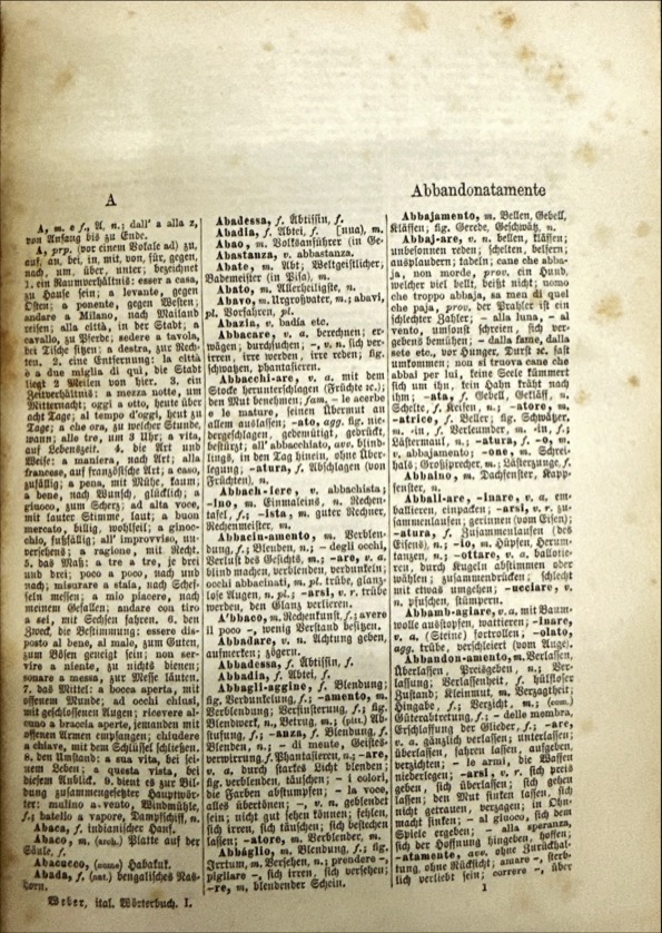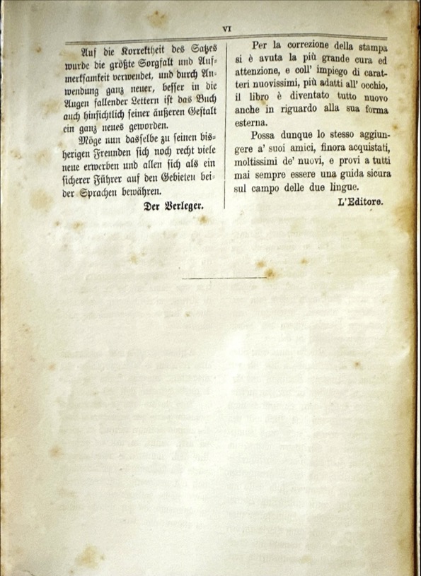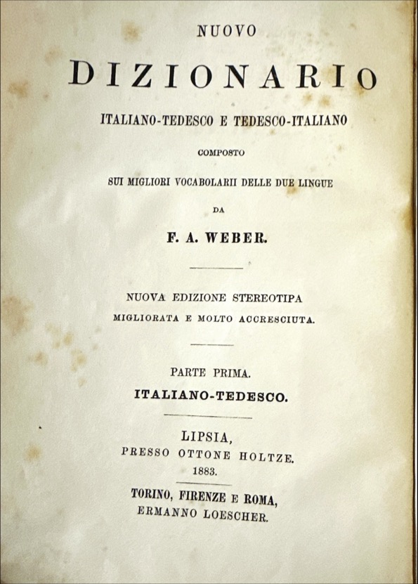 NUOVO / DIZIONARIO / ITALIANO-TEDESCO E TEDESCO-ITALIANO / COMPOSITO / SUI MIGLIORI VOCABOLARII DELLE DUE LINGUE / DA / F. A. WEBER / NUOVA EDIZIONE STEREOTIPA / MIGLIORATA E MOLTO ACCRESCIUTA / PARTE PRIMA / ITALIANO-TEDESCO / LIPSIA / PRESSO OTTONE HOLTZE / 1883 / TORINO, FIRENZE E ROMA / ERMANNO LOESCHER