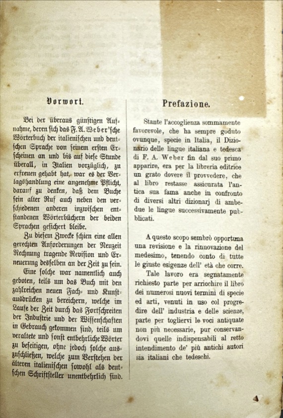 In questa edizione del 1883 compare per la prima volta una prefazione firmata dall'editore sia in tedesco sia in italiano. Per un maggiore approfondimento sul paratesto del dizionario di Weber, si rimanda alla scheda dedicata a Weber 1840.