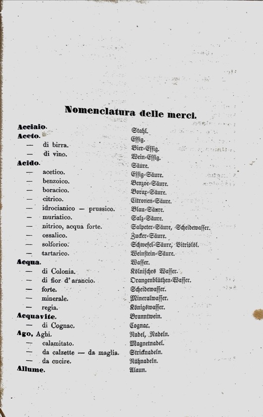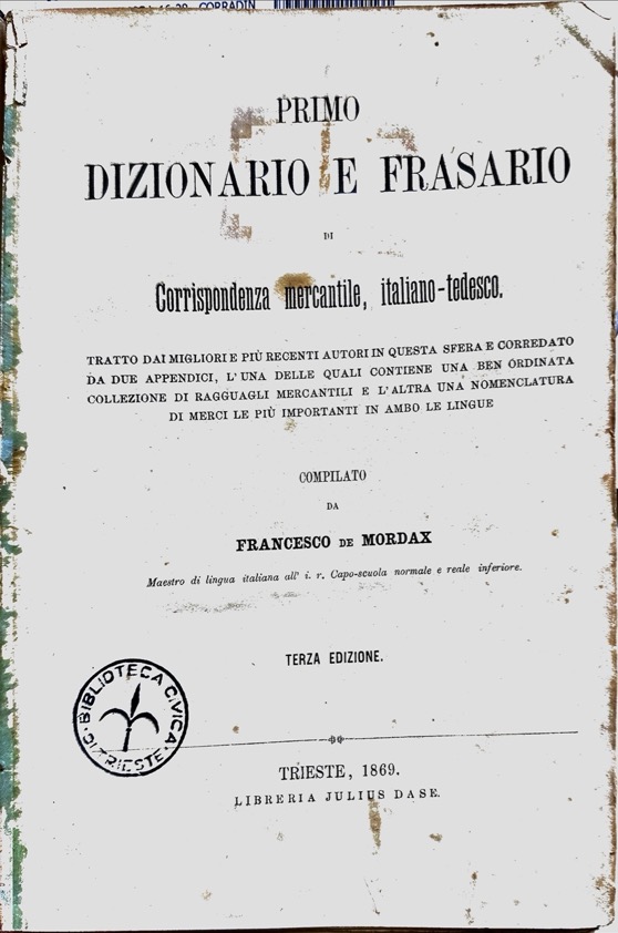 PRIMO / DIZIONARIO E FRASARIO / di / Corrispondenza mercantile, italiano-tedesco / TRATTO DAI MIGLIORI E PIÙ RECENTI AUTORI IN QUESTA SFERA E CORREDATO / DA DUE APPENDICI, L'UNA DELLE QUALI CONTIENE UNA BEN ORDINATA / COLLEZIONE DI RAGGUAGLI MERCANTILI E L'ALTRA UNA NOMENCLATURA / DI MERCI LE PIÙ IMPORTANTI IN AMBO LE LINGUE / COMPILATO / DA / FRANCESCO DE MORDAX / Maestro di lingua italiana all’i. r. Capo-scuola normale e reale inferiore / TERZA EDIZIONE / TRIESTE, 1869 / LIBRERIA JULIUS DASE